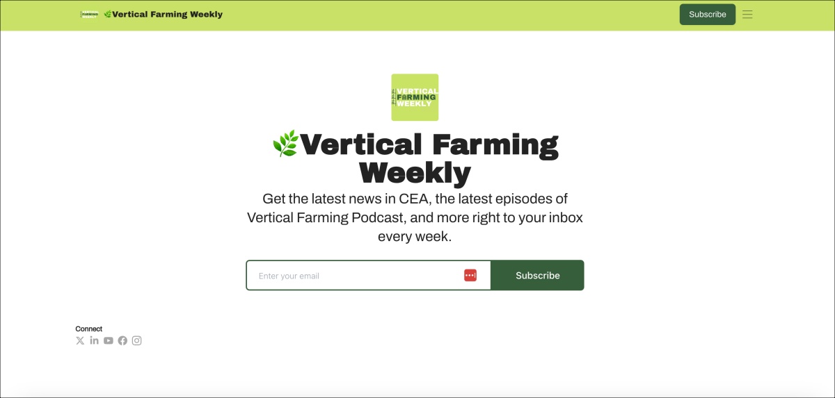 He also started a weekly newsletter called Vertical Farming Weekly that curates 10 top headlines about the industry. Distributed through Beehiiv, the newsletter has grown to around 1,600 subscribers and helps drive traffic to new episodes.