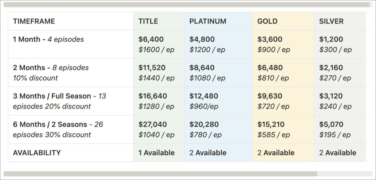 The tiers included Title, Platinum, Gold, Silver, and single-episode sponsorships. However, Harry priced the single episode prohibitively high to discourage one-off placements.