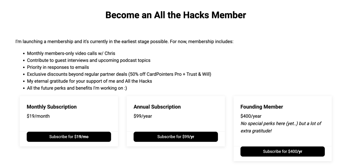 Sell tools and resources your audience needs—for Chris, this has included his credit card optimization spreadsheet. He is also building a comprehensive course on travel hacking.